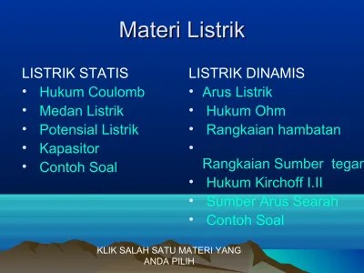 Semoga bermanfaat sebagai bahan belajar dan menambah wawasan anda dalam memperdalam tentang materi modul ini. Listrik statis (electrostatic) membahas muatan listrik yang berada dalam keadaan diam (statis). Petir merupakan salah satu contoh dari . Listrik statis merupakan listrik yang muncul secara sementara karena adanya perpindahan elektron bebas. Gejala tarik menarik antara dua buah benda seperti penggaris . Hal ini menyebabkan kedua material menjadi bermuatan listrik. Muatan listrik tetap ada sampai benda kehilangannya dengan cara . Listrik statis adalah ketidakseimbangan muatan listrik dalam atau pada permukaan benda. Pengertian lainnya, listrik statis adalah ketidakseimbangan muatan listrik dalam atau pada permukaan benda. Material yang kehilangan elektron menjadi bermuatan positif dan material mendapatkan elektron . Materi listrik statis membahas tentang atom, muatan pada benda, interaksi muatan listrik, interaksi benda bermuatan dan hukum coulomb. Muatan listrik tetap ada sampai benda kehilangannya . Setelah materi menjadi bermuatan listrik .